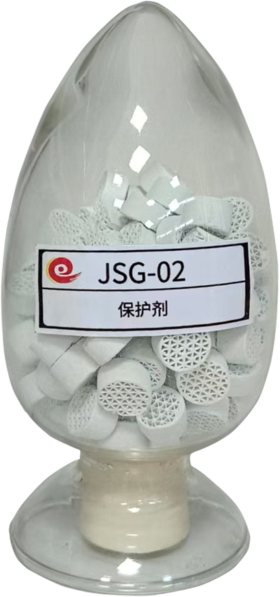 JSG-02是负载适量金属的蜂窝鸟巢保护剂,JSG-02保护剂是在高孔容大比表面积异形载体上负载优选的活性金属组元,可对原料中的胶质和烯烃以及稠环芳烃、金属进行转化和加氢饱和,达到防止压降上升、延长运转周期、脱胶质、保护主催化剂的目的。